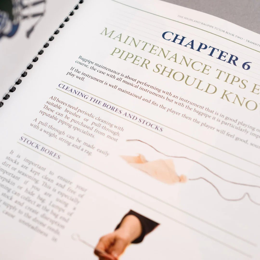 Volume 2 of the Highland Bagpipe Tutor Book, published by Scotland's National Piping Centre, is "A Guide to Playing and Maintenance of the Highland Bagpipe." This is an excellent resource for the beginning or intermediate piper, containing important information for selecting and setting up a set of pipes. It can help students transitioning to the bagpipes to understand the parts of the pipe, how they fit together, how to maintain them, and how to keep your new pipes running properly. The layout is very clear and easy to follow, and the crisp color photos are a great feature.